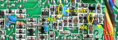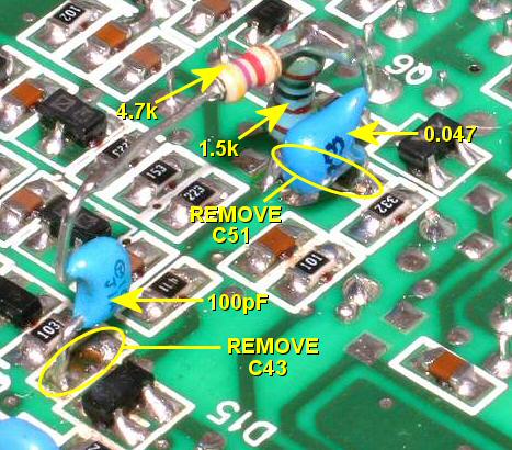 the 100pF surface mount ceramic capacitor C43. Remove the 0.047uF surface mount ceramic capacitor C51. Mount vertically a 0.047uF (473) ceramic capacitor and a 1.5k resistor at C51. The capacitor goes to the PCB pad closest to the surface mount resistor marked 332, see photo. The resistor goes to the other pad of C51. Join together the free ends of the capacitor and resistor then solder them as shown. At this junction solder one end of a 4.7k resistor and take it horizontally to a 100pF (101) ceramic capacitor mounted vertically back down to the PCB at C43, see photo. It goes to the pad furthest from C51. |